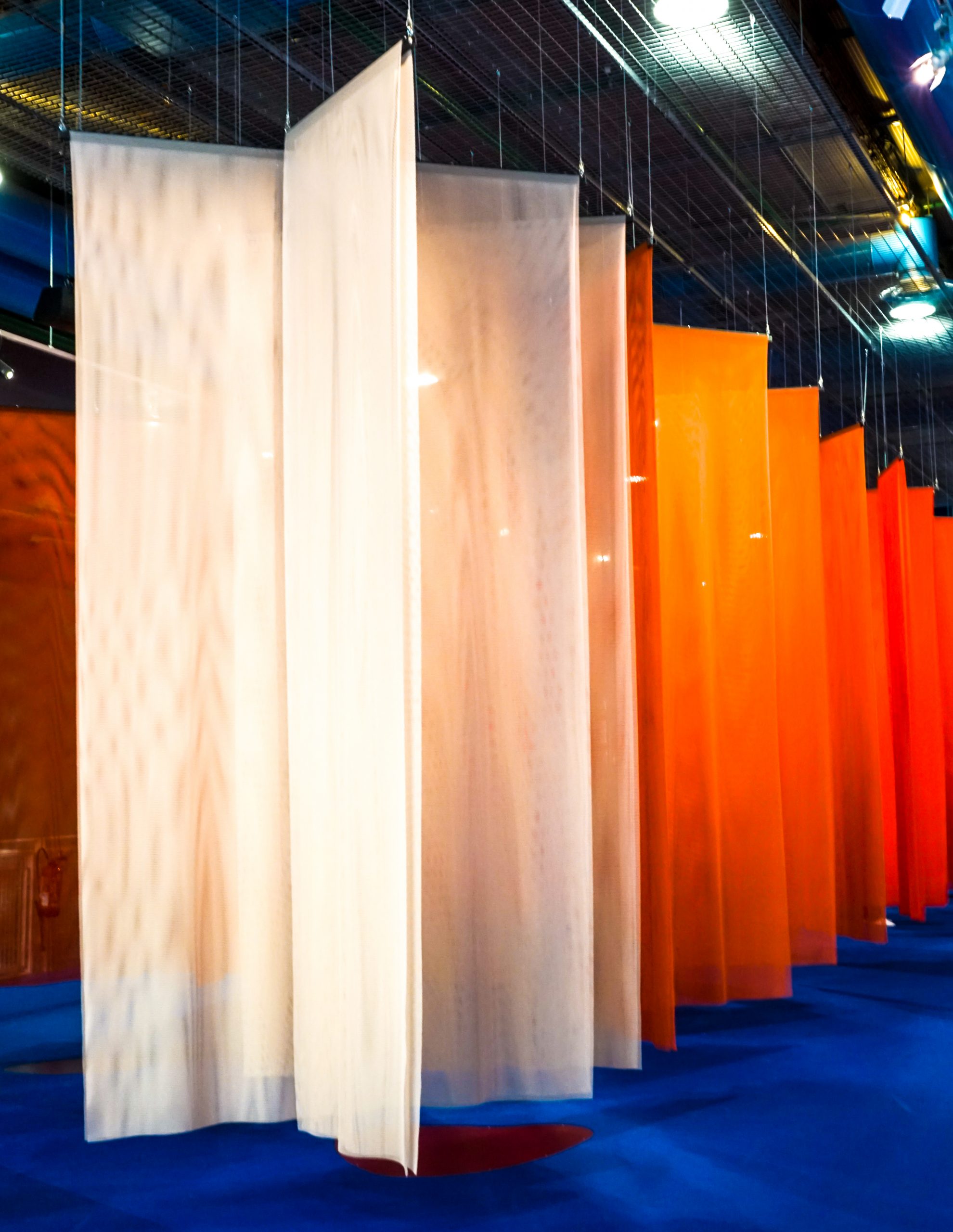 Dès l’entrée de l’installation, la question des sens est posée : le visiteur veut-il faire l’expérience de la traversée les yeux bandés ? Des masques sont à sa disposition pour qu’il aiguise le toucher et l’ouïe en se privant de la vue. Les enfants s’emparent de la proposition en guidant leurs parents masqués dans le labyrinthe des membranes verticales, ou en étant guidés par eux. L’installation de Davide Balula invite donc à se mettre à l’écoute de ses sensations intimes, mais aussi à entrer en contact avec les autres.