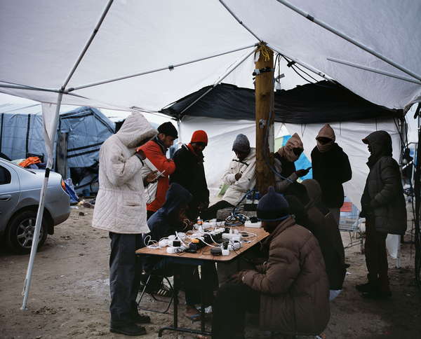 La troisième partie de l’exposition donne à voir des images réalisées par plusieurs habitants du campement, souvent prises avec un téléphone portable. Certains étaient des professionnels de l’image avant leur arrivée en France, d’autres ont suivi des ateliers menés par des associations pour les initier à l’expression par l’image. Les visiteurs peuvent ainsi découvrir le regard sur la « jungle » posé par des personnes dans l’attente de papiers, d’une autre vie ou cherchant à recharger leur téléphone portable pour contacter des proches restés au pays.