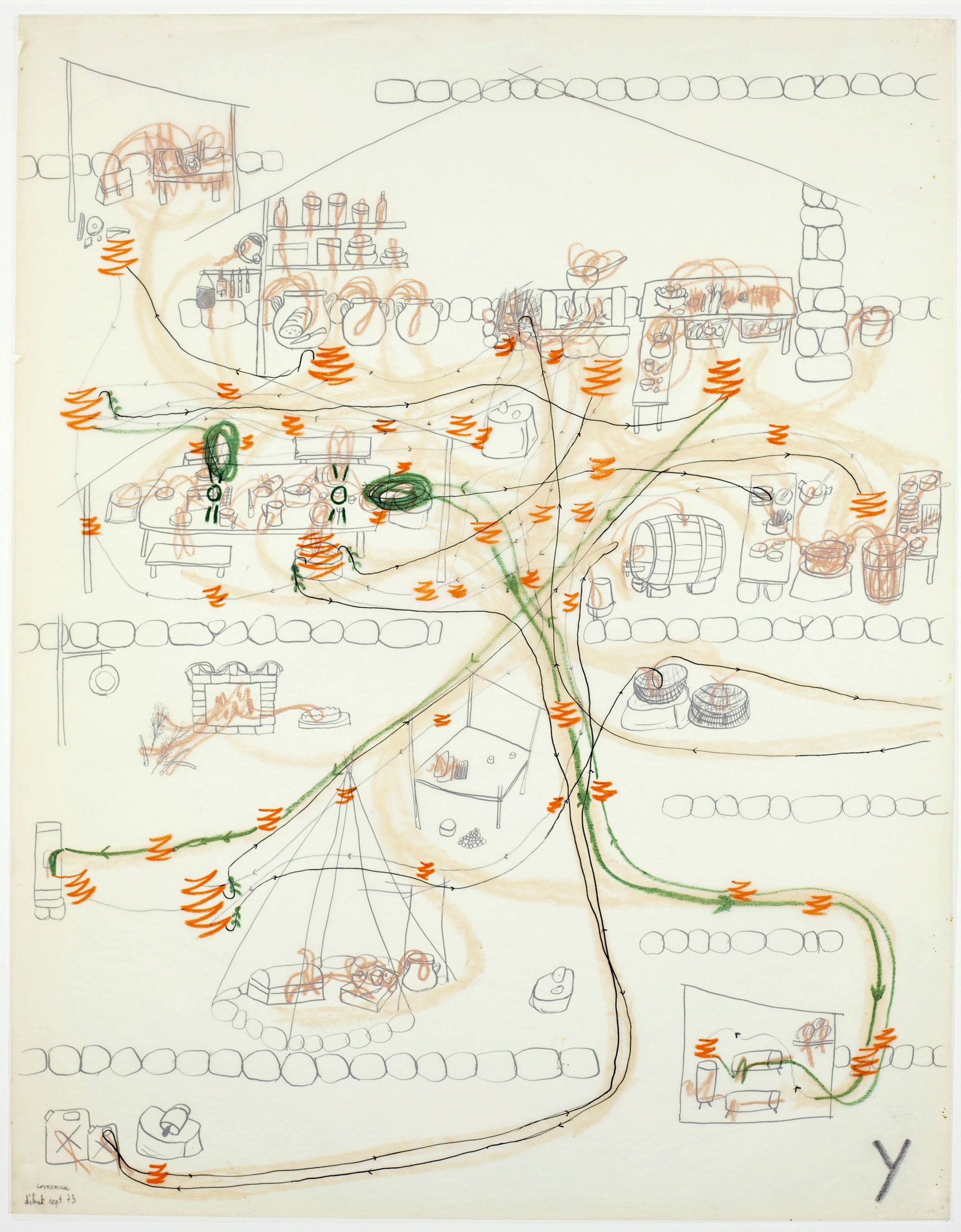 Sur le calque sont reportés les parcours et gestes de l’enfant surnommé « Cornemuse » dans cet espace. Les lignes désignent ses trajets, ses « lignes d’erre ». Celles au crayon indiquent les trajets qu’il accomplit seul ; celles à l’encre de Chine ceux auxquels il est incité par un adulte ; les lignes au pastel vert indiquent les trajets coutumiers, « réitérés » (jusqu’à son lit, au WC, à la table des repas). Le calque est constellé de signes orange qui marquent les points où Cornemuse s’arrête et se balance (on note la présence de petits bonhommes au pastel vert, qui désignent la présence d’un adulte l’incitant à poursuivre son parcours).