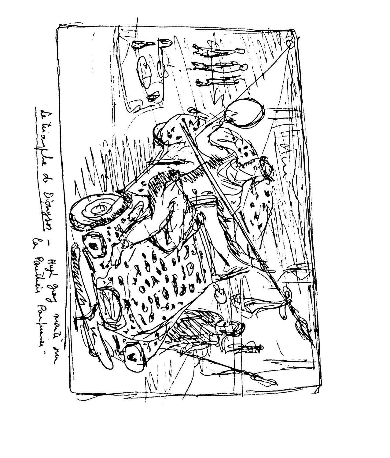 Cette reproduction de dessin est extraite du story-board du film de Jean Rouch Dionysos et légendée à partir du scénario écrit en mai 1983.