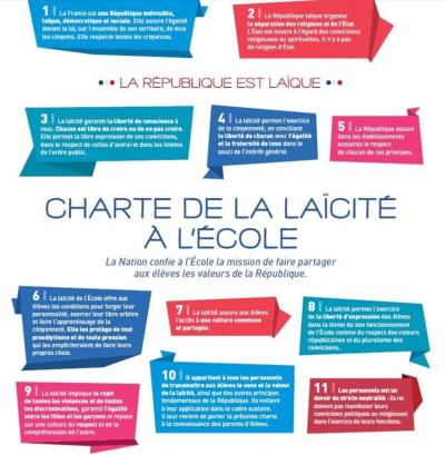 La communauté enseignante dans les écoles publiques et laïques communique les valeurs de la République à tous les enfants en respectant les principes fondamentaux de liberté de conscience, d’égalité de droits et de fraternité : nul ne peut afficher son appartenance à une religion ni à aucune conviction qu’elle soit religieuse, athée, politique ou autre (loi 2004). Mais l’école est également le lieu où les discussions et les débats sont favorisés.