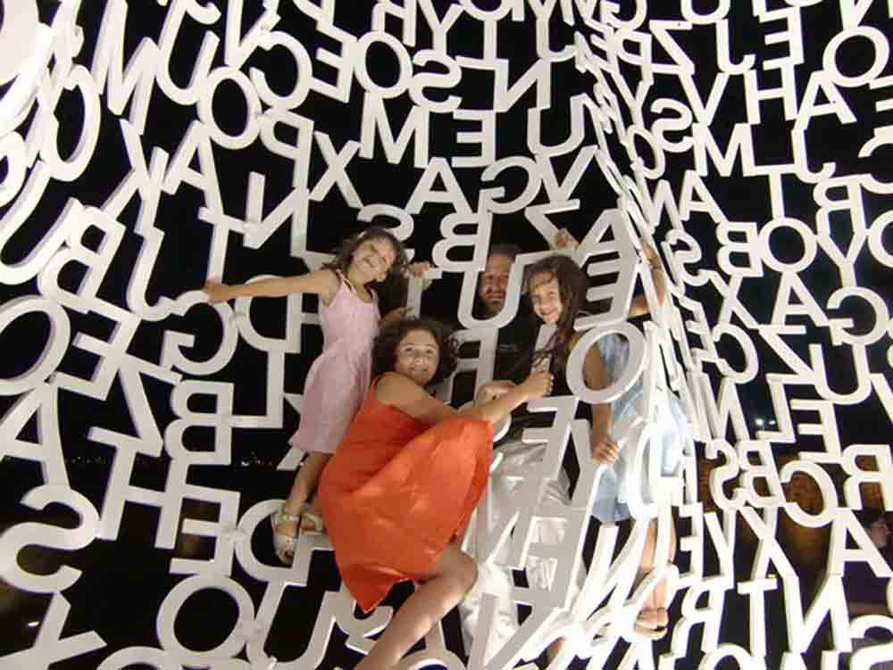 Sur cette image, un père et ses trois filles jouent sur un rideau de lettres. Cette image très symbolique évoque la liberté d’expression artistique et corporelle engendrée par la non scolarisation. De ces visages souriants et corps en mouvement se dégagent une sensation de bien être.