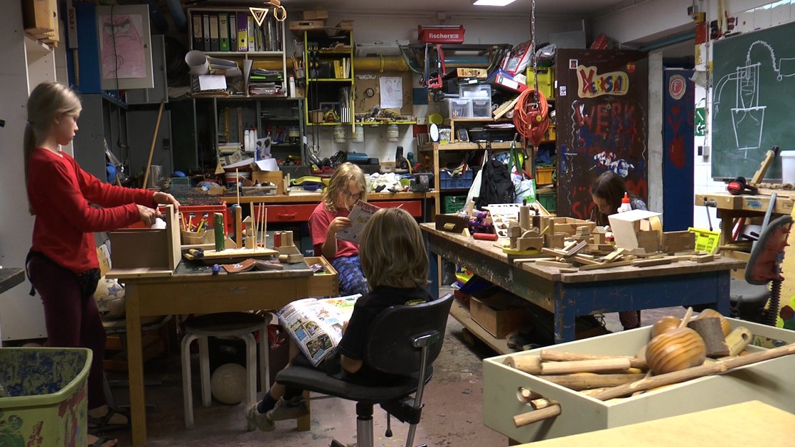 Sur cette image, les élèves de la Freie Schule Tempelhof sont à l’atelier menuiserie. Ils s’approprient cet espace à leur manière, sciant, coupant, lisant, bavardant, à leur rythme, sans en référer forcément à l’adulte.