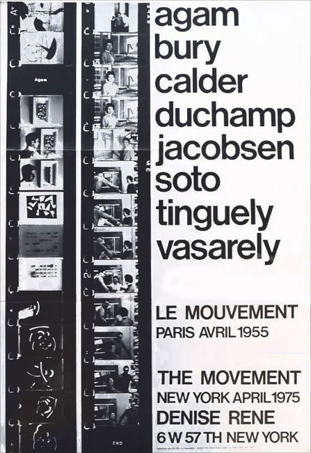 En 1955, l’exposition « Le Mouvement » à la galerie parisienne Denise René réunit de jeunes artistes – Yaacov Agam, Pol Bury, Arne Jacobsen, Jesús-Rafael Soto, Jean Tinguely et Victor Vasarely – aux côtés de figures tutélaires de l’art comme Marcel Duchamp et Alexander Calder. En rupture radicale avec l’abstraction lyrique qui domine la scène artistique de l’après-guerre, il s’agit pour ces artistes de perturber la perception et les repères spatiaux du spectateur grâce à des dispositifs optiques.