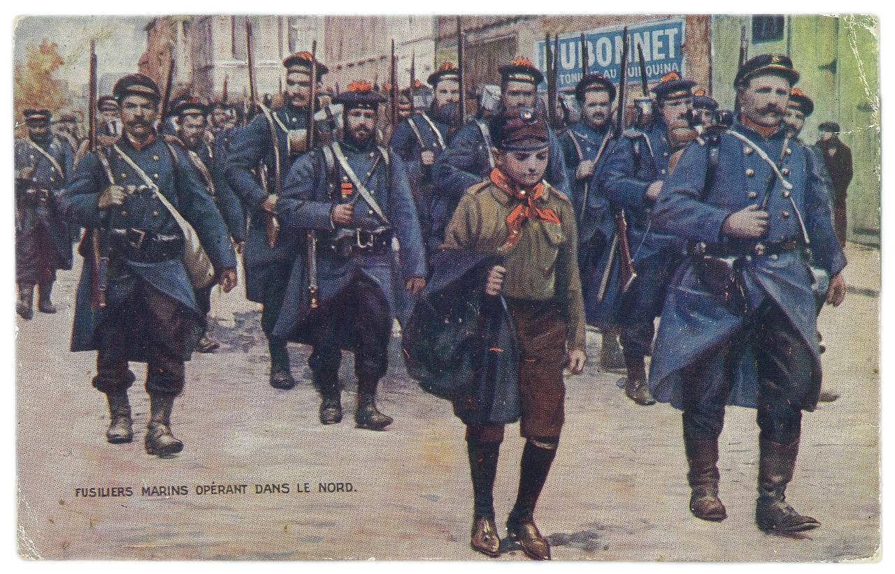 Une troupe de fusiliers marins en déplacement dans les rues d’une ville du Nord.