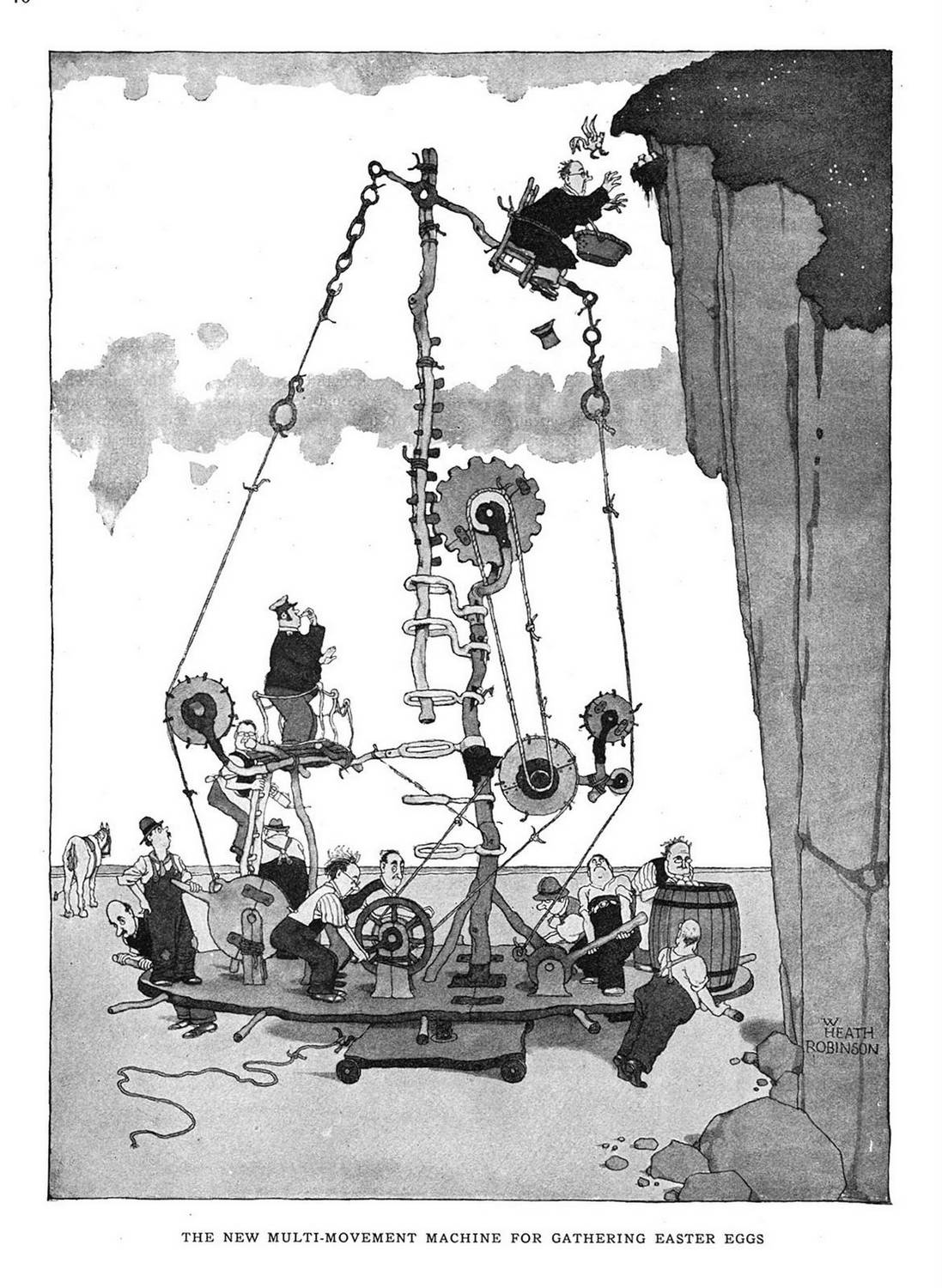 Issu d’une famille d’artistes, W. Heath Robinson a débuté sa carrière par l’illustration de textes classiques mais c’est l’édition jeunesse qui lui a permis d’exprimer sa créativité et de laisser cours à son imagination. Il se met à inventer des machines extrêmement complexes pour atteindre un but dérisoire : extracteur de verrue, éplucheur de pomme de terre, ramasseur de mégots… Pendant la Première guerre mondiale, ses dessins ridiculisaient l’armée prussienne, et la guerre en général, en lui prêtant des armes secrètes parfaitement absurdes : le souffleur de bombes tombant des zeppelins, les attrapeurs de bombes, le couvreur de tranchées, le mortier pour ravitailler en vivres les aéroplanes en vol… Dans les années trente, il fut surnommé « The Gadget King » (roi du gadget).