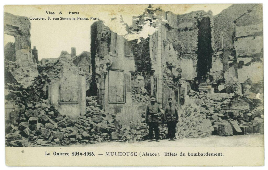 Une vue de Mulhouse (Alsace) montre les effets du bombardement.