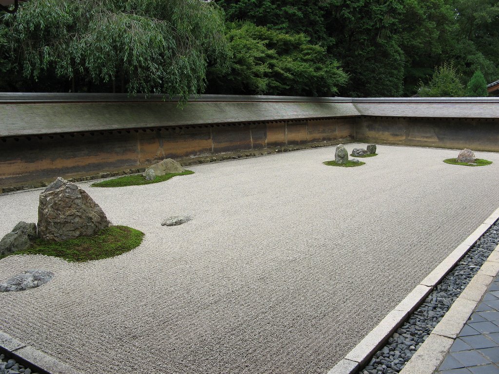 Le karesansui est certainement le plus déconcertant pour les occidentaux. On l’appelle aussi jardin sec, jardin zen ou jardin de méditation ou encore jardin de sables. Beaucoup de temples zen possédaient ce type de jardin. Le jardin du temple Ryoan-jiou « Temple du Dragon en paix », à Kyōto, inscrit au patrimoine mondial, en est un parfait exemple. Il a été dessiné au 15e siècle par le peintre Sôami. D’environ 200 m2, implanté sur un terrain plat et cerné par des murets simples ou couverts de toit de tuiles, bordé au nord d’une véranda de bois, ce jardin à dominante minérale propose une lecture abstraite et symbolique de la nature. L’eau y est représentée par une étendue de graviers et de sable blanc parfaitement ratissée, la mousse remplace le gazon et évoque l’usure du temps. Quinze roches affleurent par petits groupes de cette mer minérale et jouent avec les perspectives de telle sorte que le regard n’arrive à en distinguer au maximum que quatorze. La quinzième ne se verrait qu’avec l’esprit. Les roches font l’objet d’interprétations diverses : ce sont des montagnes, des moines, une tigresse traversant la mer avec ses petits… Quelques pistes à méditer.