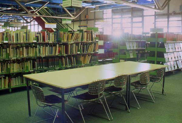 Signalétique Au-dessus des rayonnages sous forme de chiffres géants et au-dessus des bureaux d’informations sous forme de panneaux, la signalétique primaire indique les grandes classes documentaires et les espaces regroupant des documents par supports (Presse, Musiques,…). Une couleur est attribuée à chaque ensemble documentaire qui permet de l’identifier (vert d’eau pour la littérature, bleu clair pour les arts, bleu foncé pour l’histoire, etc), fonctionnant en subtil camaïeu par étage.