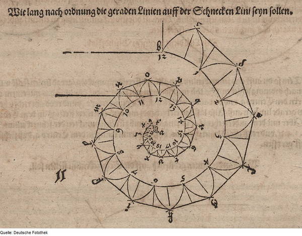Le plus remarquable sucesseur de Léonard de Vinci fut Albrecht Dürer. Grande figure de la Renaissance, il découvrit l’œuvre mathématique de Pacioli lors d’une visite à Venise. Il publia en 1525 Instructions pour la mesure à la règle et au compas de figures planes et solides, plus connu sous le nom de La Mesure. En plus d’y exposer sa philosophie de la beauté qui réside dans l’harmonie des proportions, cet ouvrage décrit la construction d’un grand nombre de courbes comme la spirale basée sur le nombre d’or, connue depuis comme la spirale de Dürer.