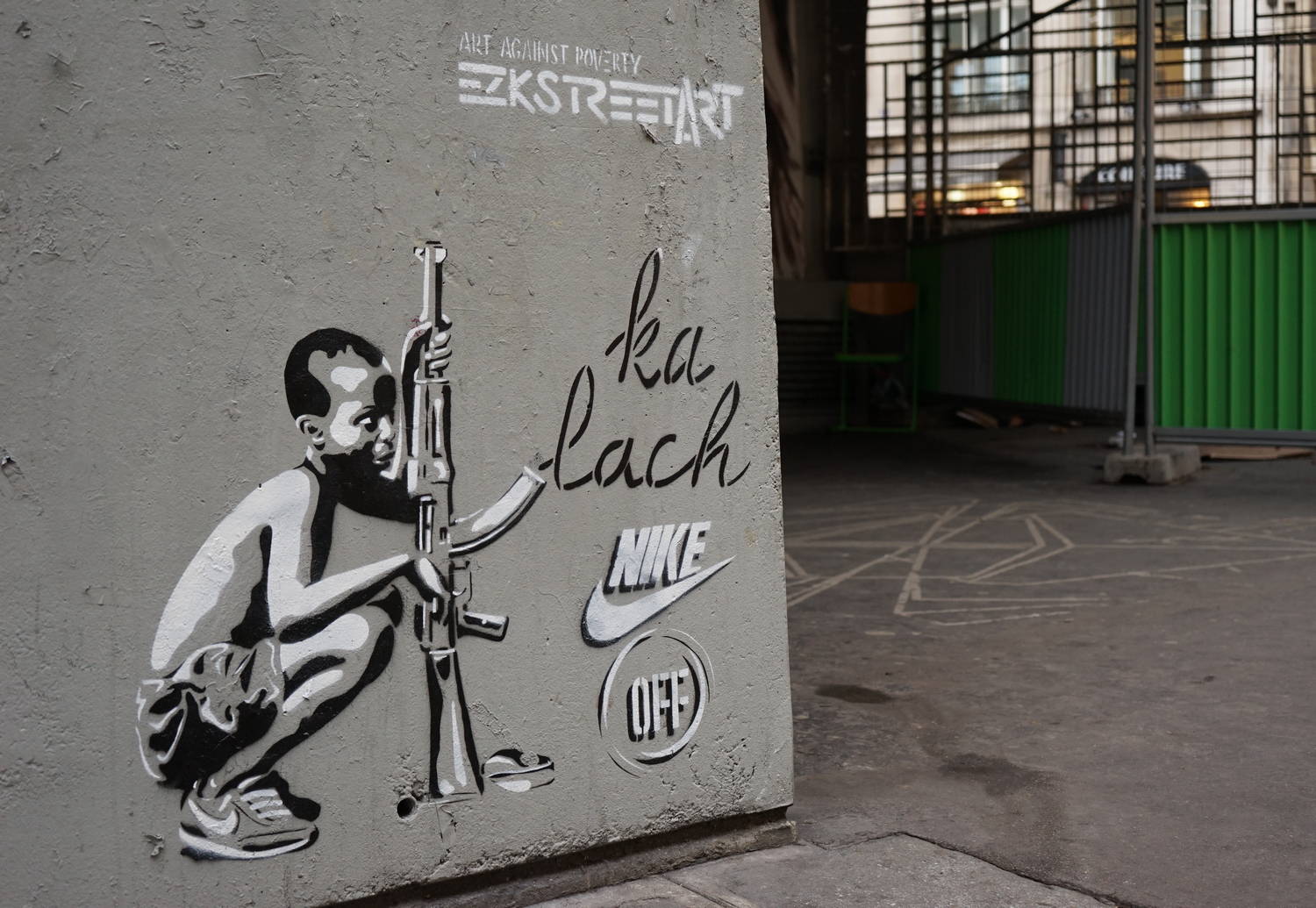 Peut-être avez-vous vu ces enfants accompagnés d’un petit texte sous forme de jeu de mots sur les murs de Paris. Il s’agit du projet artistique « Art Against Poverty » du street artiste français EZK. Cet artiste aime interpeller le passant avec des formules choc intégrant des noms de marques détournées, souvent des marques de luxe, en contraste avec l’image d’un enfant pauvre.