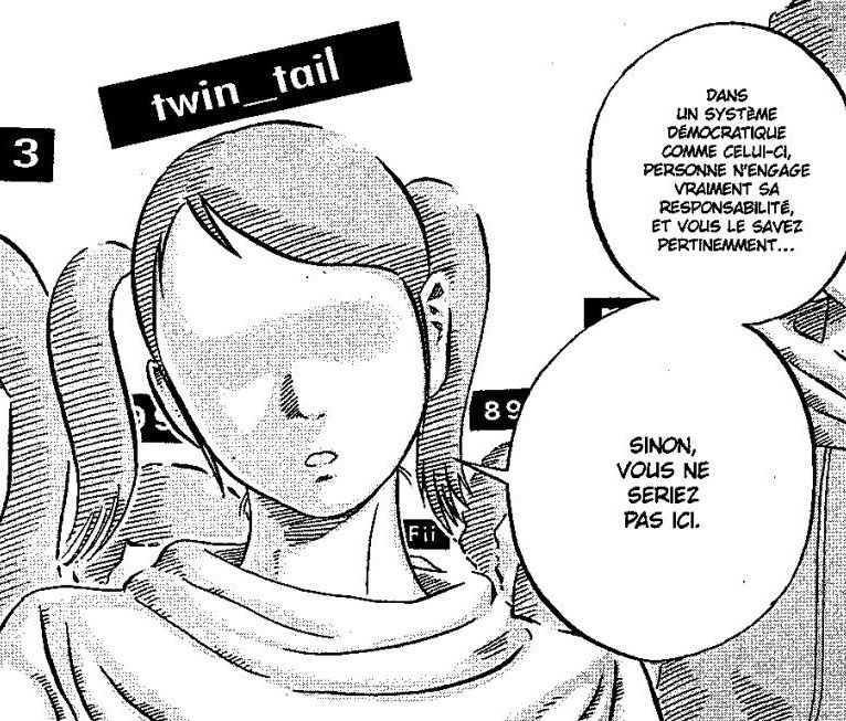 Cette image issue de Demokratia, de Motorô Mase, représente une utilisatrice anonyme dont l’ordinateur a été aléatoirement sélectionné pour y installer l’application Demokratia. Celle-ci permet à ses 3000 usagers réguliers de décider collectivement, par un système de propositions et de votes, des faits et gestes et des compétences de Maï, un humanoïde aux traits féminins dont la nature robotique doit rester secrète.