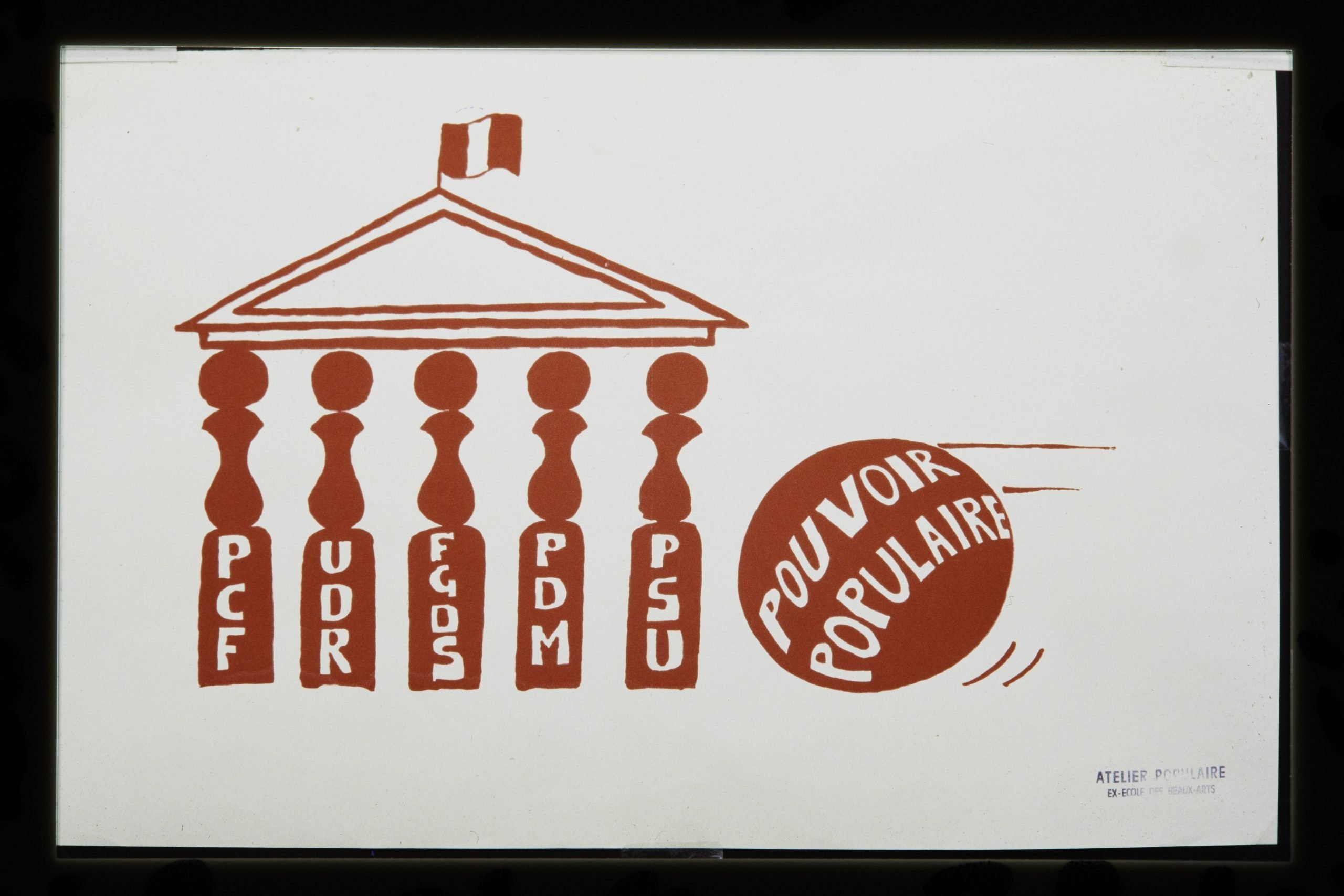 Le 8 mai 68, un comité de grève se met en place à l’École des Beaux-Arts de Paris. Des artistes et intellectuels rejoignent les étudiants et, ensemble, ils organisent la grève : des assemblées générales se tiennent quotidiennement et, très vite, les premières affiches sont imprimées puis diffusées. Le collectif réalise d’abord des lithographies, puis des sérigraphies. Cette technique permet en effet d’intensifier la production et de reproduire une image à des milliers d’exemplaires.