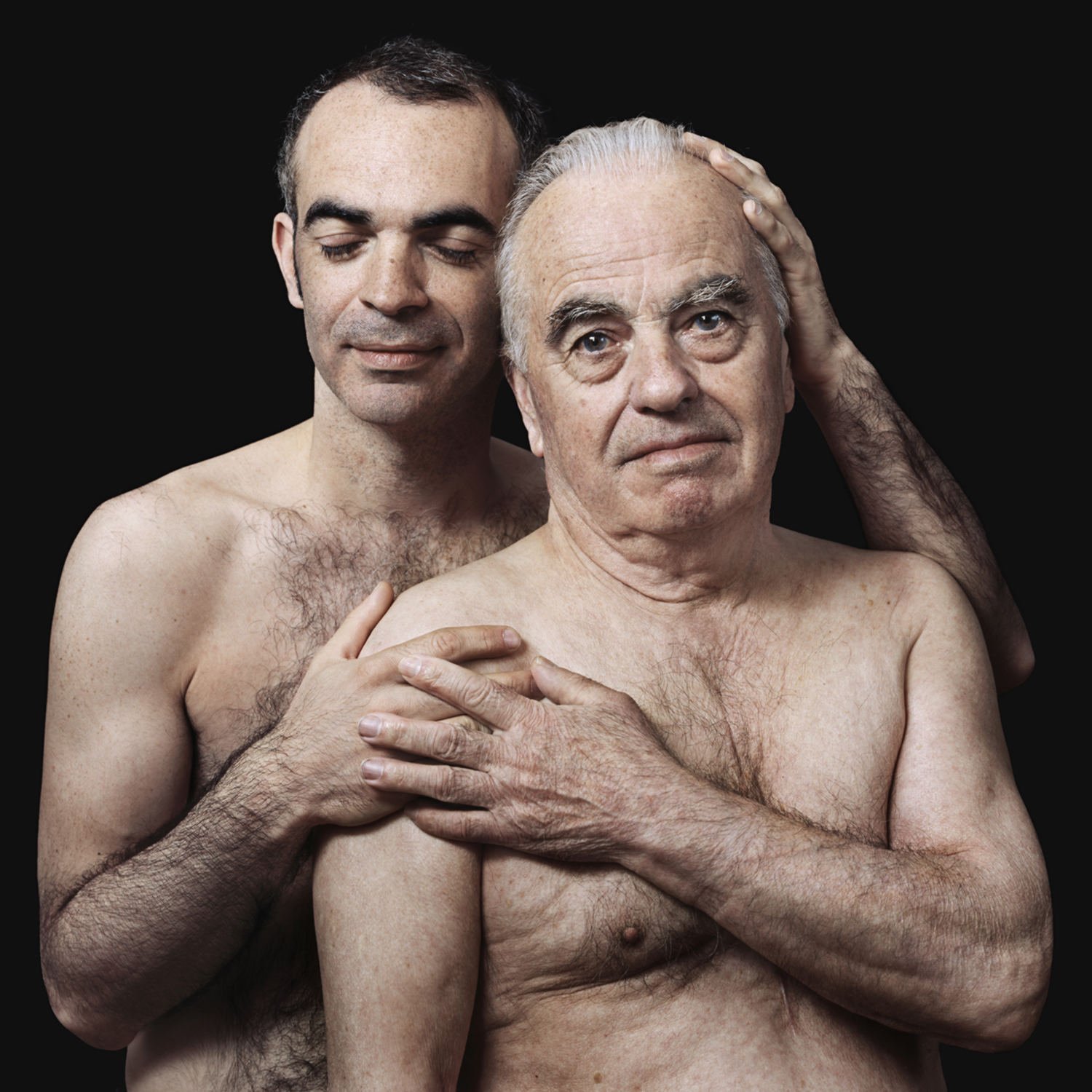 « Qu’est-ce qu’un père ? Qu’est-ce qu’un fils ? Quel est le lien qui les unit ? Le sang ? L’amour ? La transmission ? L’héritage ? Je photographie des pères, de 30 à 80 ans, debout, torse nu, avec leur fils de quelques mois pour les plus jeunes ou entrés dans la cinquantaine pour les plus âgés. Ils sont proches, souvent peau contre peau. En regardant ces portraits, on recherche les ressemblances. On scrute les traits du visage, on compare les gestes, les attitudes. On imagine une histoire. On tente de percer le mystère de la relation. La nudité des corps jette le trouble, brouille un peu les pistes. »