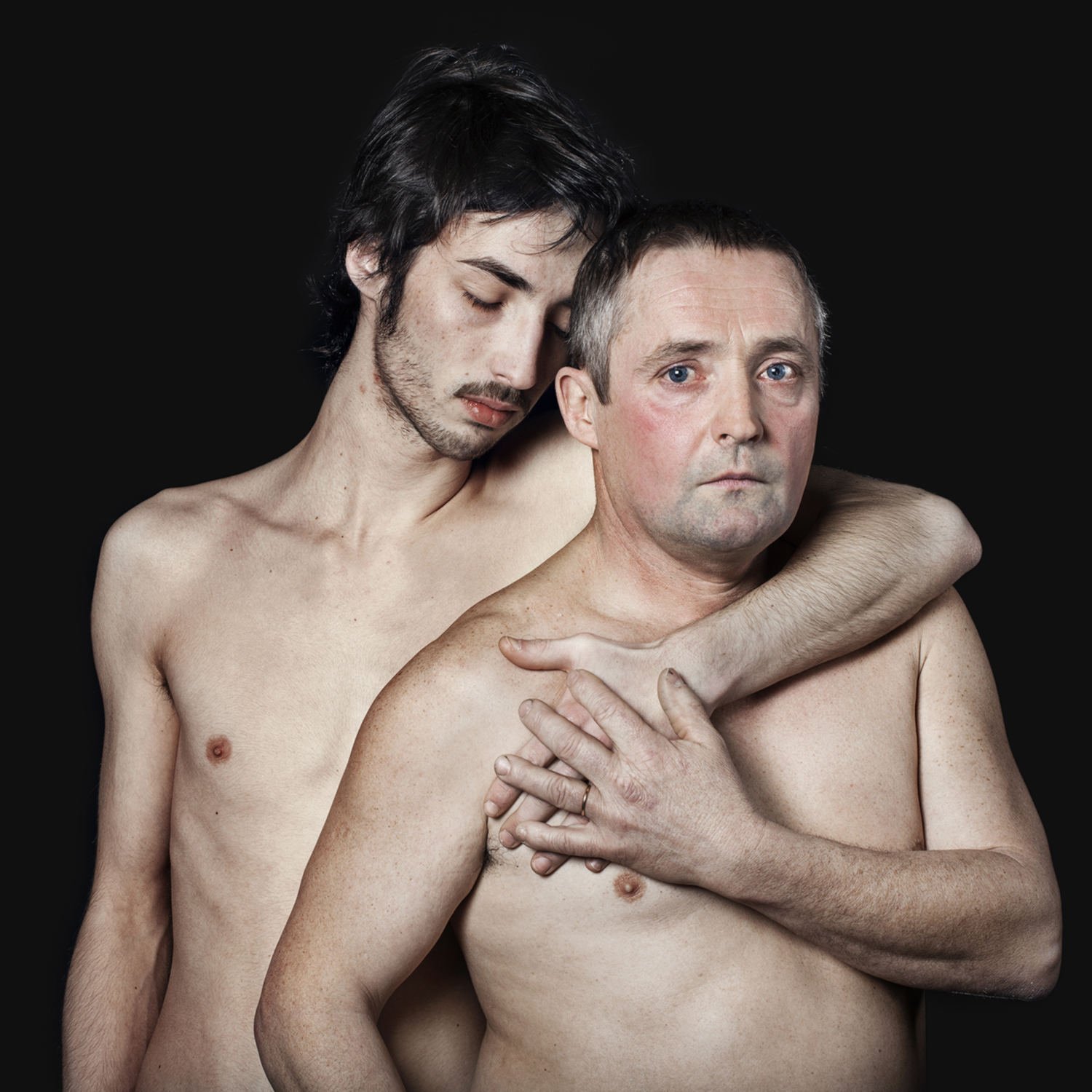 « Qu’est-ce qu’un père ? Qu’est-ce qu’un fils ? Quel est le lien qui les unit ? Le sang ? L’amour ? La transmission ? L’héritage ? Je photographie des pères, de 30 à 80 ans, debout, torse nu, avec leur fils de quelques mois pour les plus jeunes ou entrés dans la cinquantaine pour les plus âgés. Ils sont proches, souvent peau contre peau. En regardant ces portraits, on recherche les ressemblances. On scrute les traits du visage, on compare les gestes, les attitudes. On imagine une histoire. On tente de percer le mystère de la relation. La nudité des corps jette le trouble, brouille un peu les pistes. »