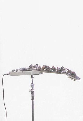 Dans cette œuvre, les oiseaux viennent picorer les cordes d’une guitare électrique. Cette rencontre entre les volatiles et l’instrument crée le réel. « On est pas dans la scène, on est dans le réel », dit d’ailleurs l’artiste, pour qui « le processus de transformation des phénomènes en mouvement […] est au centre de [ses] préoccupations ».