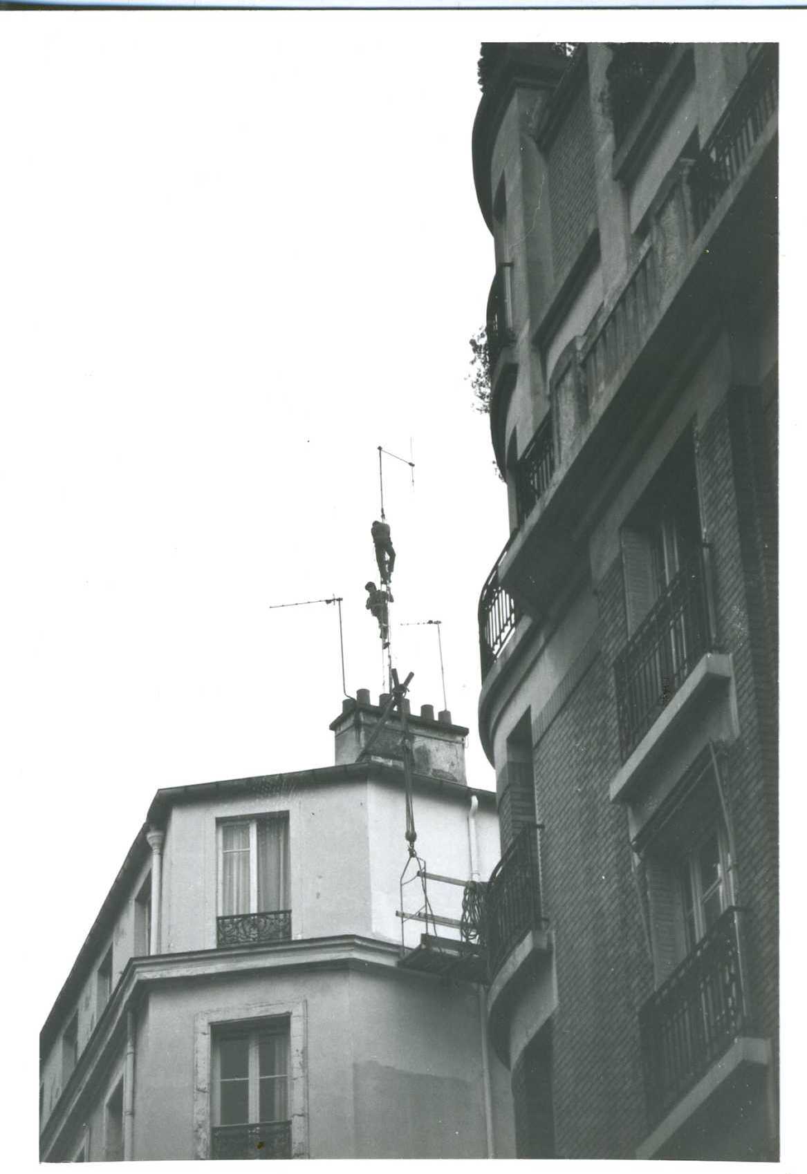 Sur cette photo, les techniciens de la police judiciaire portent le coup de grâce à Radio Libertaire. Le dimanche 28 août 1983 vers 6 heures du matin, ils montent sur le toit du studio et sectionnent le câble de l’antenne. Les anarchistes s’attendaient à cette intervention policière : ils avaient organisé des tours de garde et toutes les nuits des animateurs dormaient dans le studio. Mais les forces de l’ordre ont agi extrêmement vite et au moment où la radio est la plus vulnérable.