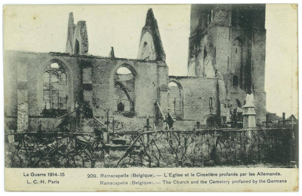 L’église et le cimetière de Ramscapelle, en Belgique, profanés par les allemands.