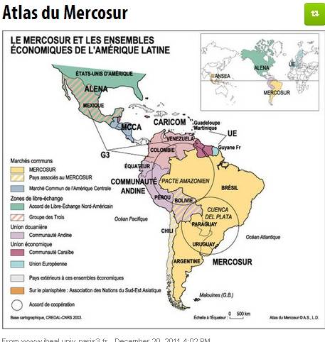 L’INHEAL avec le Centre de Recherche et de Documentation sur l’Amérique latine (CREDAL-CNRS) publie en ligne sous la direction de Martine Droulers, Hervé Théry,… l’Atlas du Mercosur, un ensemble de cartes sur l’organisation des territoires dans cet espace économique du sud [Carte de l’Atlas du Mercosur] Le Mercosur, alliance économique, regroupe depuis 1991, le Brésil, l’Argentine, le Paraguay, l’Uruguay, auxquels sont associés la Bolivie et le Chili, soit un espace de plus de 12 millions de kilomètres carrés en Amérique du Sud. Les cartographes prennent un point de vue supra national qui oublie provisoirement les frontières pour rendre l’ampleur des changements qui affectent ces territoires. Les phénomènes de migration, de croissance urbaine, d’évolution technologique, de développement des voies de communication, de déforestation ou de préservation de l’environnement… redessinent constamment les contours de ce grand espace englobant 3,5 millions de kilomètres carrés de forêt tropicale et équatoriale, la forêt amazonienne.