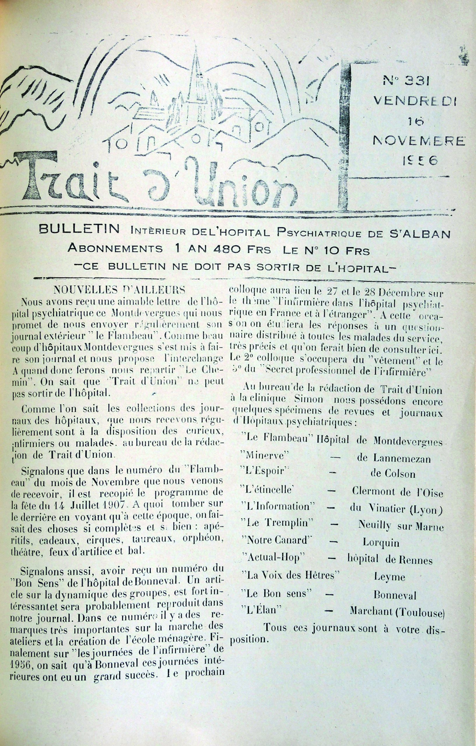 Pour conclure notre série sur l’hôpital de Saint-Alban, nous avons choisi un extrait du journal, Trait d’Union, produit au sein de l’hôpital.