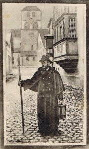 « Il était interdit aux ouvriers de travailler à la lumière ; à huit ou neuf heures du soir, la cloche du beffroi sonnait le couvre-feu ; en outre, sa lanterne à la main, un veilleur de nuit parcourait les rues avec sa psalmodie célèbre : « réveillez vous gens qui dormez » dite sur un ton mélancolique et invitant les bourgeois à dormir en paix, ou à prier si le sommeil les fuyait… »